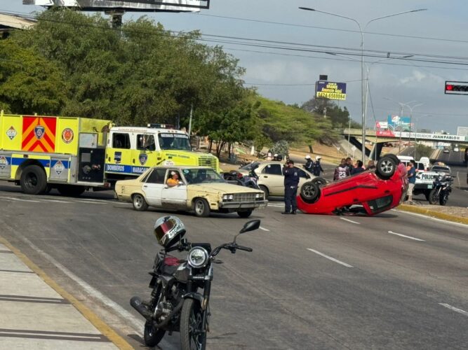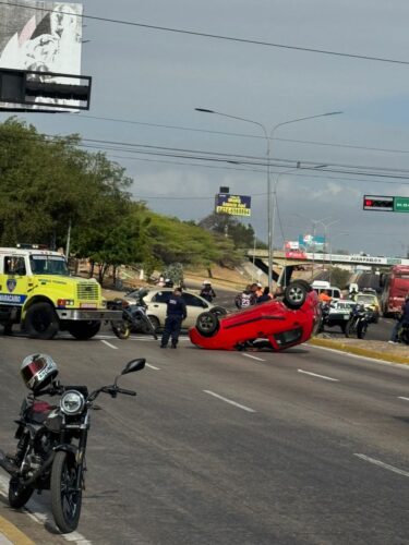 Las locuras al volante siguen sin freno en Maracaibo, no disminuyen para nada los accidentes viales de tamaña proporción como este vuelco impresionante de un auto que quedó totalmente patas arriba frente a la sede de PDVSA, Edificio Miranda y frente a Makro, en la avenida Padilla.