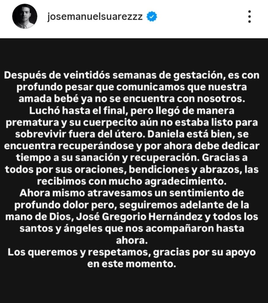 Daniela Alvarado, quien recientemente había compartido la alegría de su estado de gestación, agradeció el apoyo médico recibido y la discreción de sus allegados. Por su parte, José Manuel Suárez reafirmó su apoyo incondicional a su esposa, destacando la valentía y fortaleza de Daniela en este difícil tránsito.