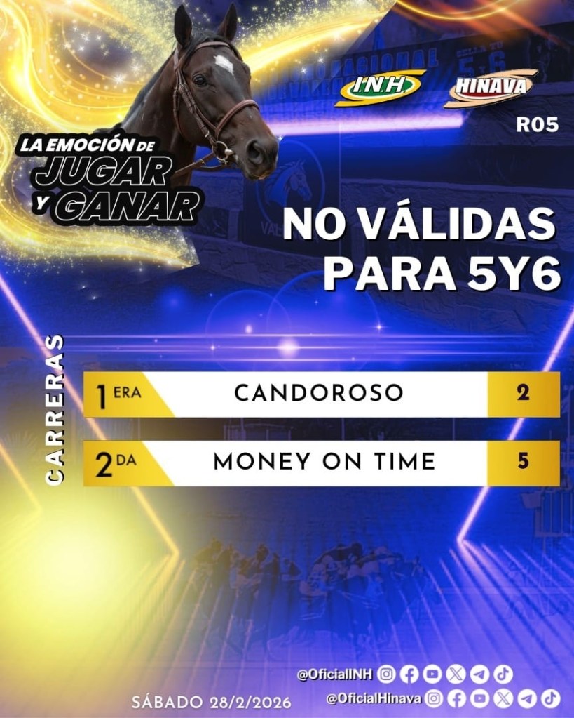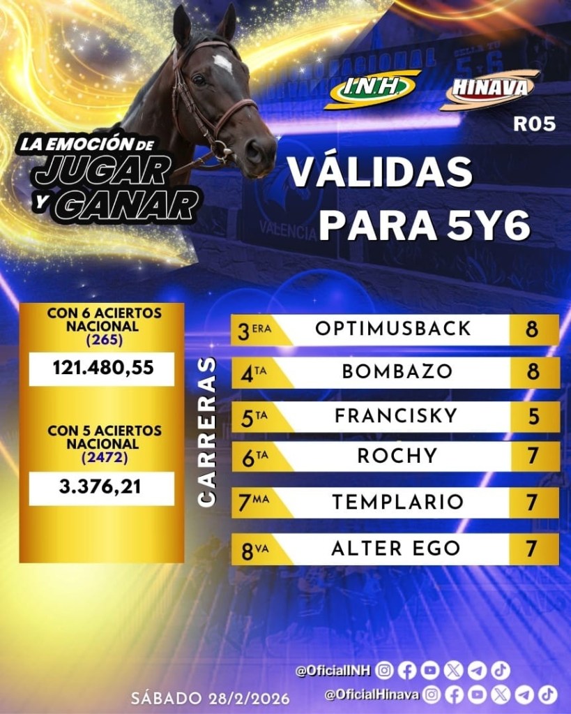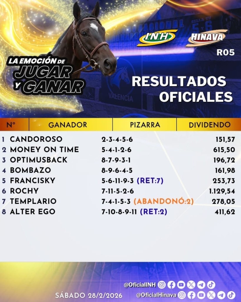 La reunión 5 de la temporada hípica en el Hipódromo Nacional de Valencia se realizó este sábado 28 de febrero del 2026, con una programación de ocho competencias, donde se cumplió la Copa Antonio Sano cuya victoria fue para el ejemplar Templario.