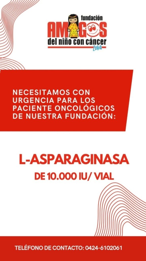 La Sociedad Amigos del Niño con Cáncer (Fundanica Maracaibo) ha emitido un llamado urgente a la solidaridad para la adquisición del medicamento L-Asparaginasa de 10.000 IU, vital para que decenas de pequeños guerreros puedan continuar sus protocolos de quimioterapia.