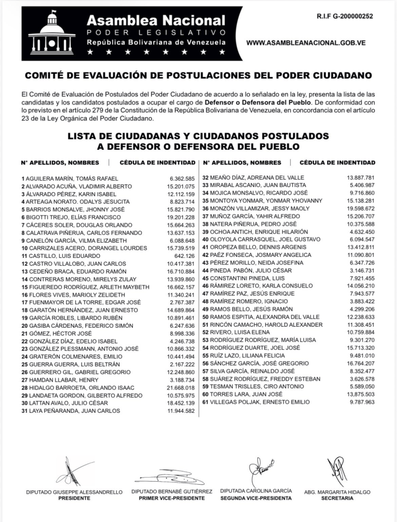 La lista de candidatos a defensor del Pueblo ascendió a 61 aspirantes. En el documento destacan nombres como los de Carlos Calatrava, docente de la UCAB, y Vladimir Alvarado, profesor de la UCV, este último avalado por el Consejo Universitario de la UCV.