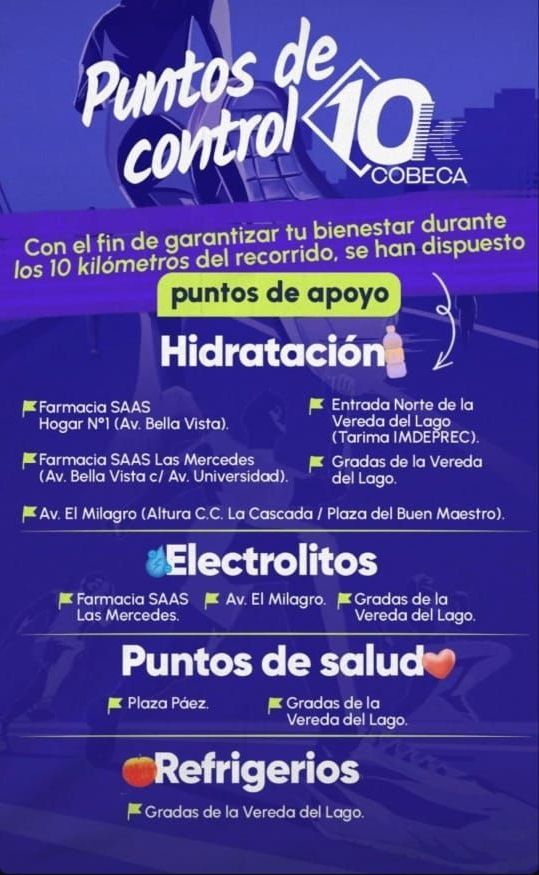 Además, con el fin de garantizar bienestar durante los 10 kilómetros de la carrera, se facilitarán puntos de hidratación, estaciones de salud con el equipo de la Dirección de Salud Maracaibo, además los corredores podrán contar con refrigerios.