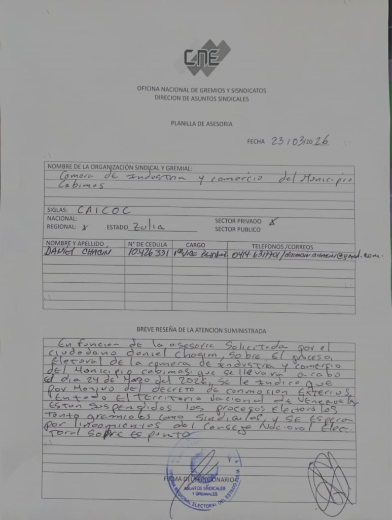 «La postura de rechazo que la legítima directiva de Caicoc ha mantenido,se refuerza como la ratificación técnica recibida hoy por parte del Consejo Nacional Electoral (CNE) a través de la Oficina Nacional de Gremios y Sindicatos en la cual confirma la suspensión e invalidez de cualquier proceso electoral gremial en el actual contexto legal del país» acotó Cedeño.