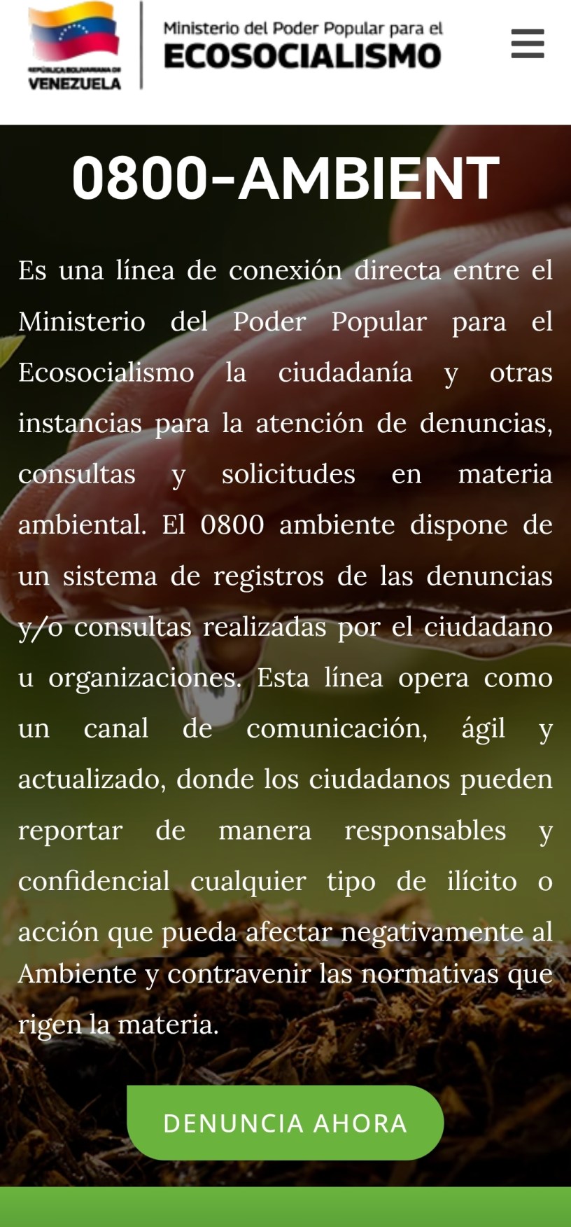 La página web (0800ambiente.com) se sumará a la línea telefónica gratuita ya existente para que los ciudadanos puedan reportar incidencias de manera ágil y sencilla.