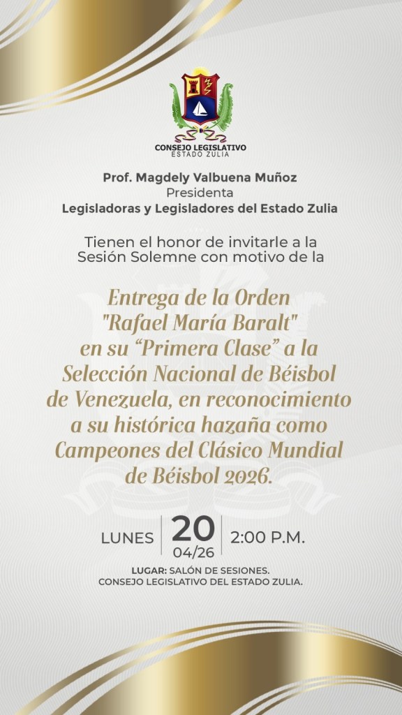 A la 1:00 p. m., la emoción se tornará en devoción cuando el trofeo sea trasladado a la Basílica de Nuestra Señora de Chiquinquirá. En este espacio emblemático, representantes deportivos y ciudadanos realizarán un acto de agradecimiento ante la Santa Patrona por los logros obtenidos en la arena internacional. Posteriormente, la ruta institucional culminará en la sede del parlamento regional a las 2 de la tarde, donde el Consejo Legislativo del estado Zulia (CLEZ) celebrará una sesión solemne para otorgar a la Selección Nacional la Orden «Rafael María Baralt» en su Primera Clase.