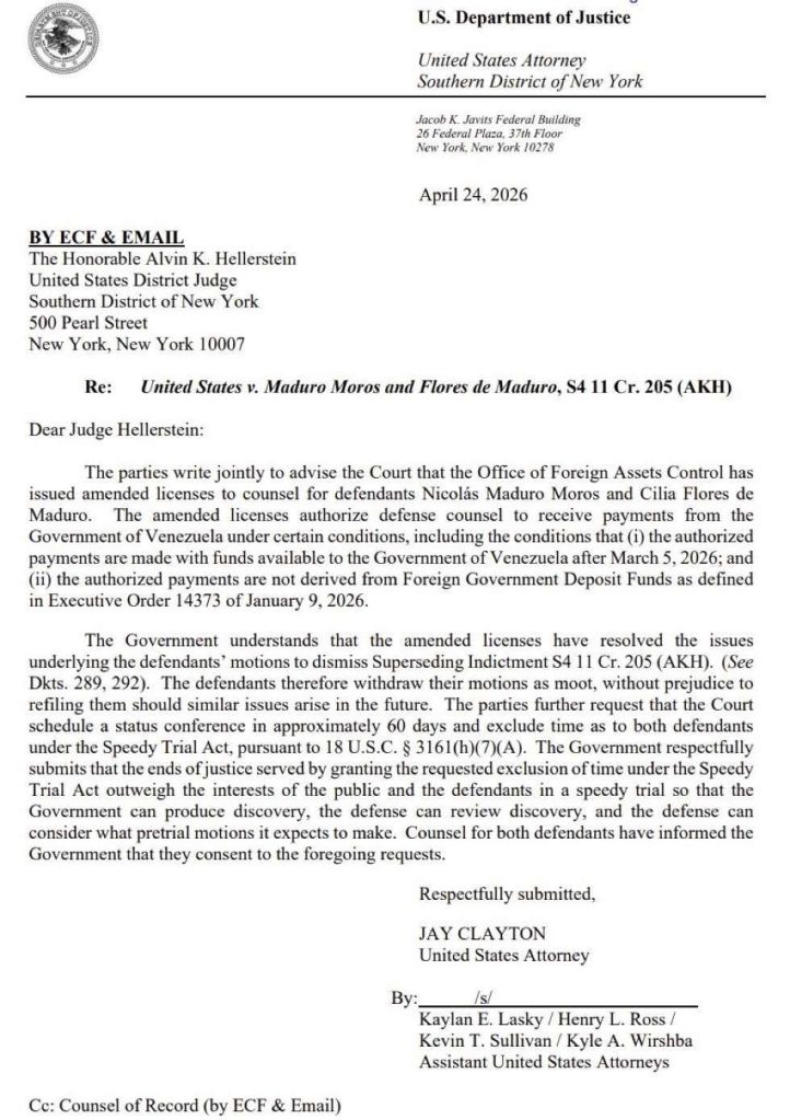 En un movimiento que sacude el panorama jurídico internacional, la Oficina de Control de Activos Extranjeros (OFAC) ha emitido licencias modificadas que autorizan al Gobierno de Venezuela a pagar los servicios legales de Nicolás Maduro Moros y Cilia Flores de Maduro. La notificación fue enviada formalmente al juez Alvin Hellerstein por el Departamento de Justicia de los Estados Unidos.