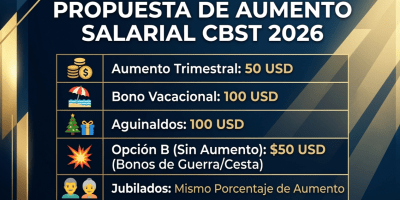 Destacado #Noticia, Economía, Nacionales La CBST propone al Ejecutivo aumento salarial trimestral de 50 dólares 11 marzo, 2026 — 0 Comentarios